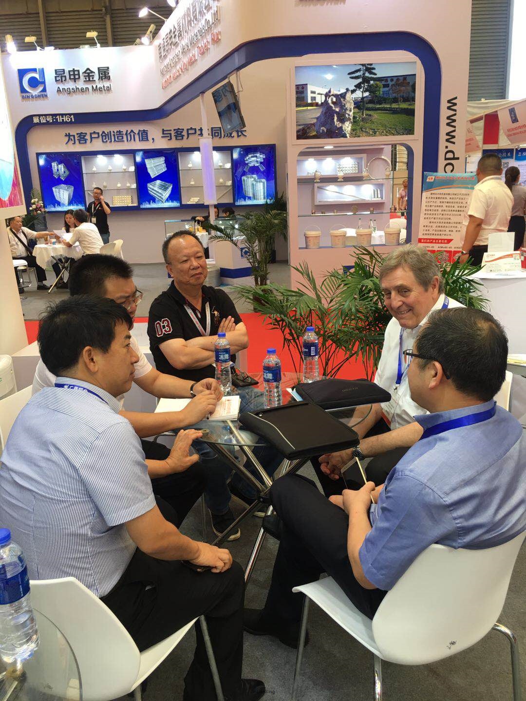 董事長陳建春先生向外國客戶介紹公司最新開發(fā)的鋁鍶合金卷材